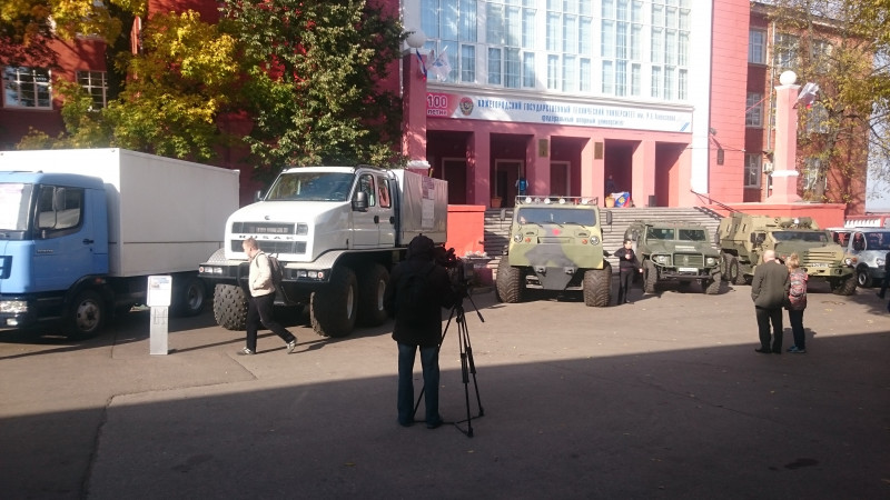 На данный момент стоят вот этот вот вездеход, пара броневиков от ВПК, грузовик "Русак" - этой же фирмы, ещё один колёсный вездеход и мобильный вездеходный роботизированный модуль.