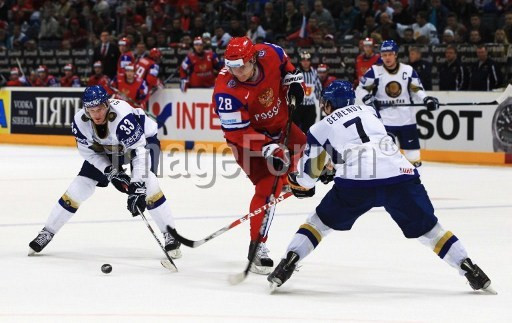GERMANY, Cologne : Kazakhstan's Maxim Semenov (L) vies with Russian's Alexander Semin during the IIHF Ice Hockey World Championship match Russia vs Kazakhstan in the western German city of Cologne on May 11, 2010. The 2010 IIHF Ice Hockey World Championships are taking place in Germany from May 7 to 23, 2010. AFP PHOTO DDP/ CLEMENS BILAN GERMANY OUT