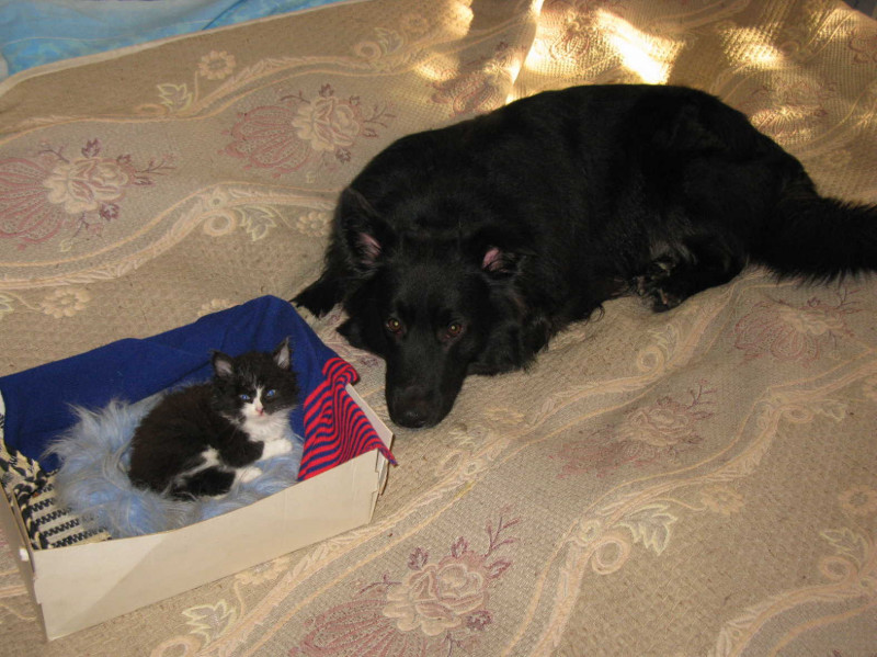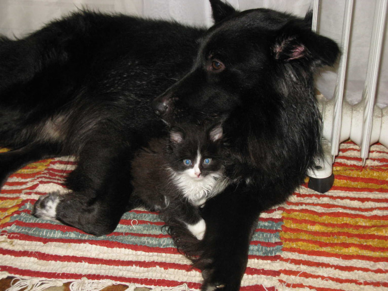 Подкинули нам под дверь полуторамесячного котенка, окрас – один в один как у Михи. Старшая кошка пыталась его "сожрать", однако Миха сказал ей-Ррррррр, и прочно занял место около коробки с децелом. Децел оценил заботу, и с тех пор они неразлучны! Котенок все время бегал по квартире между медвежьих ног, а если не успевал – вцеплялся ему в хвост и катался "на электричке"))))) Меня восхищает поведение пса…даже у кобелей, видимо, есть "материнский инстинкт"…. Медвед позволял котенку сосать свои соски…типо кормил его, блин! Когда зубки подросли, Миха визжал от боли, но терпел! До крови на сосках дело доходило, до гематом, но Миха не жаловался, любит он его очень)Еле отучили мелкого от этого. Назвали сего героя очень гордо – Евлампий Михалыч) Когда подрос, Любоффь Валерьна отрезала ему яички, во избежание "неприятных" сюрпризов)) Эти черно-белые пацаны были так неразлучны, что мы делали ставки – либо пёс начнет мяукать, либо котенок научится сначала лаять))) Кончилось тем, что котенок раньше мяуканья научился….рычать! Возьмет какую нибудь игруху в зубы, по собачьи, бегает по комнате, и рычит!! Мы из пацтала не вылазили, блин!)) Как и Медвед, по утрам приходит меня целовать, - реально, лизал мне лицо! Потом понял, что это не совсем кошачья манера, теперь просто лежит у меня на груди, ждет, когда я открою глаза…Иногда пытается губками своими открыть мне реснички!!!! Сон пропадает мгновенно!!)))Типо , мать, просыпайся уже, побеситься хочеца, да и пожрать бы не мешало)))) В общем, у нас по-прежнему весело, будем теперь время от времени баловать вас рассказами о нашем житие)))