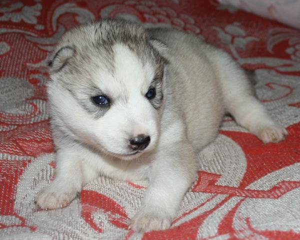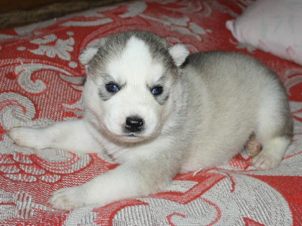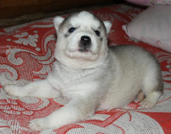 Щенки хаски серо-белого окраса, голубоглазые.