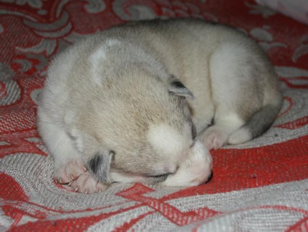 Девочка номер 1. Самая крупная из всех щенят. Серо-белая голубоглазая.