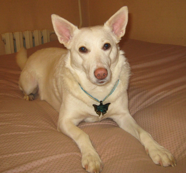 Ровно год назад она сама вышла к нашей машине худая, грязная и подмороженная (на улице было около 30 мороза). Мы честно пытались её пристроить в добрые руки. В итоге, осталась собачка с нами. Сейчас это белая довольно упитанная мадам. Из прошлого остался только страх перед незнакомыми людьми, особенно дворники и бомжи её напрягают. Через пол года домашней жизни Лиса начала играть с людьми(только со своими), не так давно произошёл ещё один прорыв: подобрав "вкусняшку" на улице выплёвывает по моему изумлённому восклицанию. Научилась ездить в машине. Ошейник для неё пока за гранью возможностей, так в шлейке и гуляем. Для себя мы решили что день рождения Алиски сегодня!