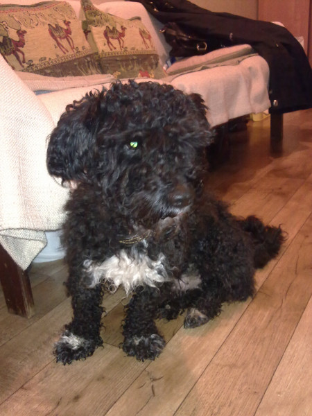 Пес бегает не первый день рядом с остановкой Стрелковая.Наверное на свободном выгуле.Но сегодня сидел и плакал,лапы превратились в сосульки,он их поджимал и постанывал.Взяла себе.Дома шарики-кубарики ,мой злой той-терьер его грызет.