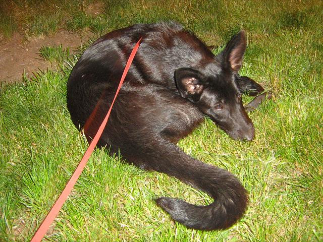 позвонил знакомый собачник вот 2 часа назад, типа, встретил собаку предположительно с переломом. я вышла- сидит красивейший щенок, овчароид (причем реально метис овчарки, видимо). стали разбираться- лапу волочит по земле, на нее не встает. у локтевого сустава утолщение. при пальпации не дергается, не скулит. тут подвернулся парень, кот. учится в меде. посмотрел, сказал, выбит сустав. стали решать что делать. телефон моего ветеринара оказался отключен, решили выбирать из 2х зол меньшее- "ветеринарная на ветеринарной или "Лео"". решили поехать на Ветеринарную. там встретил нас врач, посмотрел пристально на собаку, пощупал, спросил, какая дальнейшая её судьба (будто хотел уже предложить усыпить, если мы скажем, что отпустим после лечения), сказал, что надо делать рентген. и это не сегодня. на мои вопросы как-то лапу зафиксировать или дать обезболивающее, он сказал, что нет смысла. вот мы и уехали не солоно хлебавшие. ну а завтра-то я уже поеду к своему врачу, нормальному, у которого рентген тоже имеется. привела её домой. девчушка- ну просто умница. то, что была хозяйская- 100%. знает, что такая подъезд, квартира, сразу нашла тиарины миски и улеглась на её место. слова тоже понимает хорошо. но, увы, ни ошейника, ничего на ней нет. шерсть очень красивая, лоснится, да и сама не тощая. лежит спокойно, очень устала, иногда поскуливает.