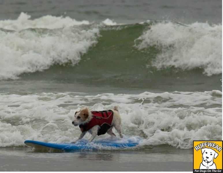 В амуниции этой фирмы выступает одна из самых известных собак-серфингистов США - джек рассел терьер Бадди