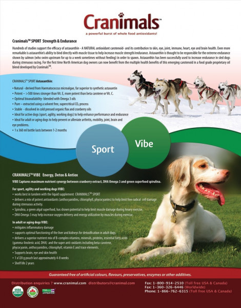 CRANIMALS VIBE - это полноценная пищевая добавка для взрослых собак, идеальна для занимающихся спортом, аджилити и рабочих собак. Представляет из себя микс различных антиоксидантов на основе натурального экстрата клюквы, морских водорослей и спирулины
