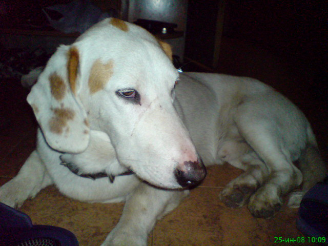 белый, ушки лежат, кажется молодой, очень тактичный - чувствуется домашний.