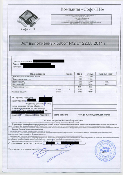 На другой день мс утра начался секс по телефону с этой конторой. После обеда выяснилось, что системник готови надо заплатить 5700. Забирать ехать самой, и только после оплаты. Эта сумма (по их акту) за: диагностику системника (то есть записанные с моих слов проблемы), химическую чистку (читай - пропылесосили спиртом контакты протёрли), настрйку ОС (снесли старую, поставили новую, это я и сама умею), настройку ПО (вместо старых программ новые поставить - опять же, могу сама ), сохранение данных (всё нужно и так было на диске Д, то есть и не потерялось бы при переустановке винды). Хотя по телефону девушка пыталась сочинять несколько иные версии (у вас было ооочень много вирусов, пришлось сильную грязь убирать специальными химикатами, а это очень вредные пары, поэтому работа дорогая и тому подобная лапша на уши для дураков, чьи рады я пополнила в тот день).