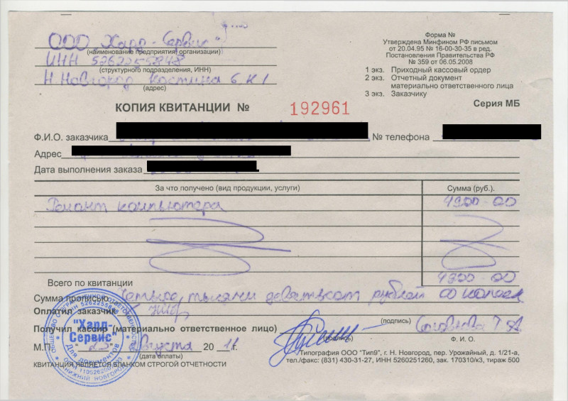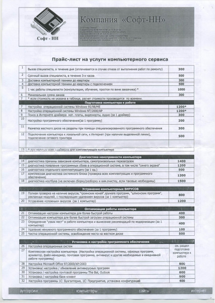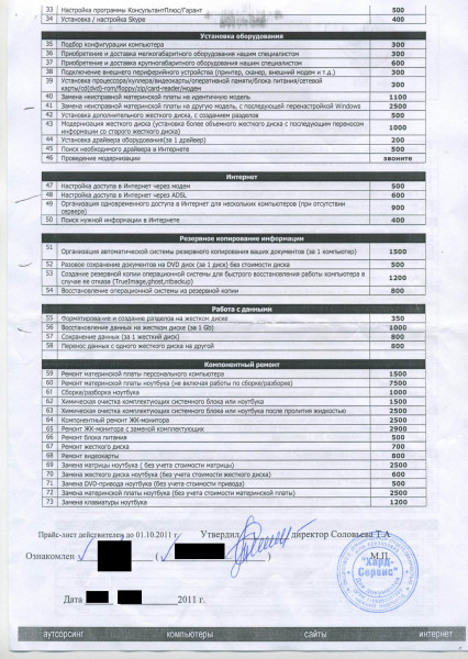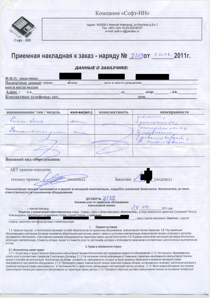 В тот же вечер ко мне приехали молодой человек и девушка (оказавшаяся, кстати, одноклассницей моей младшей сестры). Оценили проблему, записали всё в свой бланк, оставили прайс, в 2 экземплярах заявку на услуги и сказали, что системник заберут. Тут моя интуиция возмутилась и я хотела начать маленький скандальчик, не отдавать системник и вообще постать всех на фиг. Но проклятое интиллигентское воспитание, доверие к знакомым, убедительные доводы "специалистов" заставили меня заткнуться. А зря. На мои возражения, что я не увижу, что они там делают с компьютером и почём это будет стоить, мне сказазли, что "в самом плохом случае это будет стоить тысячу-полторы", что "позвонят, когда им займутся, чтобы согласовать все манипуляции", и "завтра в обед готовый системник привезут".