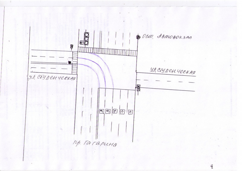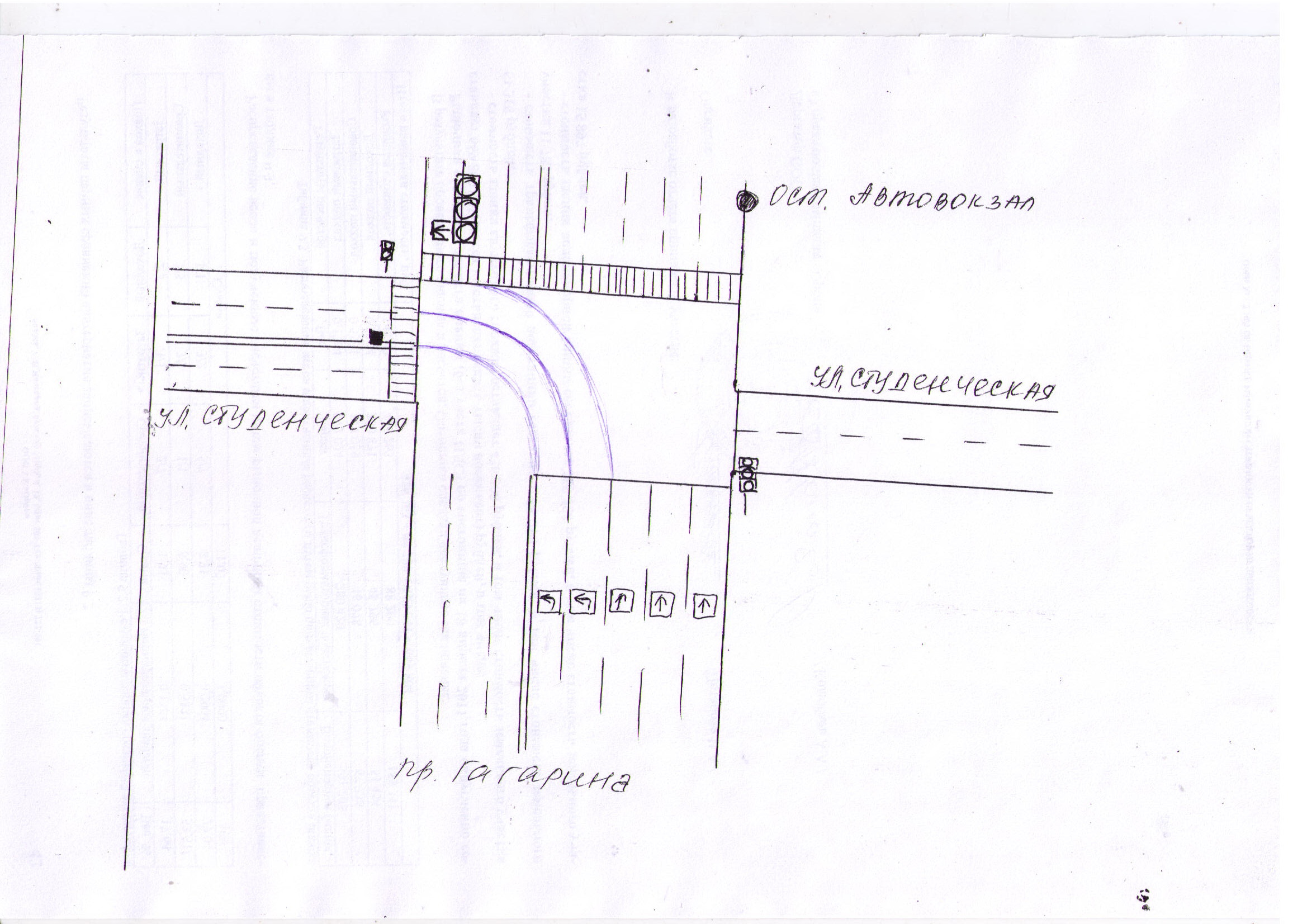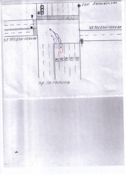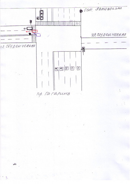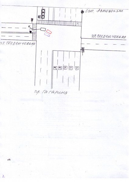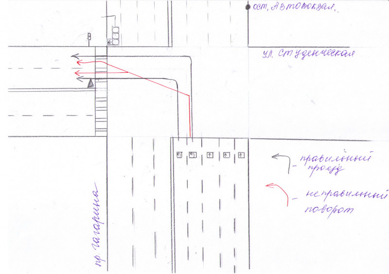 На перекрестке пр.Гагарина- ул.Студенческая имеется две полосы для поворота налево. Я стояла первая в ряду на крайней левой полосе, Тот крендель справа от меня, впереди от него была газель. загорелась стрелка и все начали движение. Так вот ПОЧЕМУ ни кто не умеет правильно проезжать перекрестки???????? Когда я начала движение меня сначала подрезала газель (на рисунке красная стрелка), я притормозила, дабы избежать ДТП, но тут же мне вслед начал сигналить тот крендель (при этом он ехал по траектории газели). В итоге картина: мне пришлось практически оказаться на встречной полосе. Но тут дело этим не закончилось, Крендель сначала ехал за газелью, и сигналил мне, но ему и этого оказалось мало, он решил еще меня "поучить", мол я неправильно проезжаю перекресток, в качестве "обучения" он решил меня совсем зажать (на моей полосе оказалось препятствие) и резко выскочив передо мной он еще решил притормозить. Благо и опыт у меня имеется, и нервы железные, но мне не понятно где учат таких водителей???? И когда у нас кончится дискриминация на дороге по половому признаку????