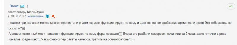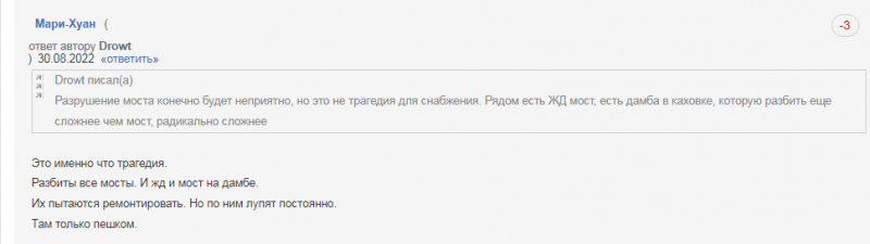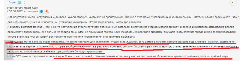 Я тебе объяснял, что в Херсоне логистические проблемы и что разрушение мостов вынудит уйти от туда российскую группировку поскольку снабжать ее без мостов проблемно.