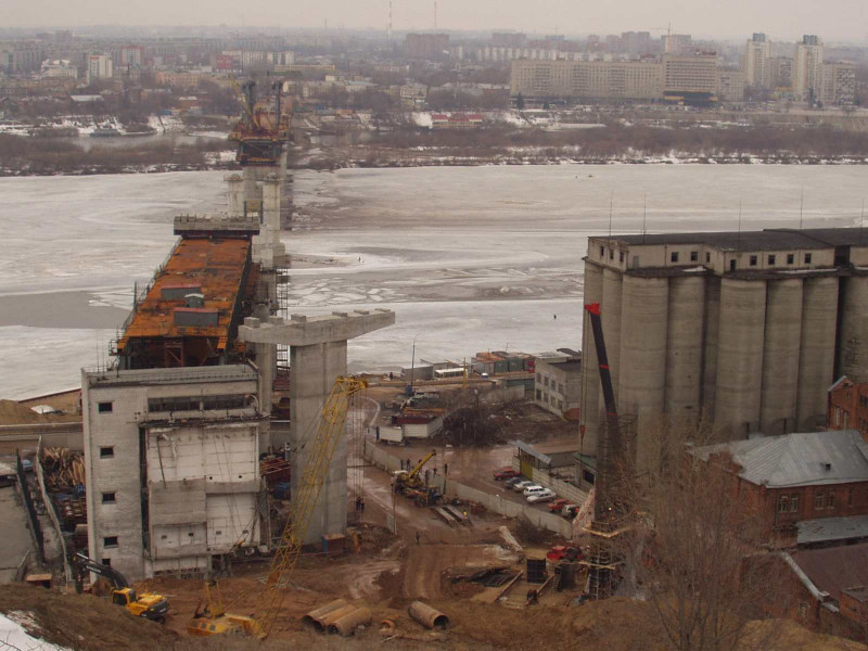 Вот на этом снимке видна первая опора и строительство второй (там, где кран черный с красным концом вверх торчит).
