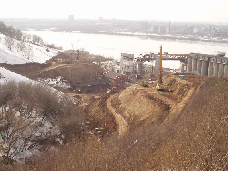 Тоже долго рассматривал пейзаж над стройкой. Для себя понял так, что, если съезжать с моста в нагорную часть, сначала едем влево вверх по эстакаде, заезжаем на небольшой холм под Гребешковским откосом, потом дорога повернет правее, пересечет гребень между двумя оврагами, в котором будет сделана выемка, и затем выйдет в верхнюю часть другого оврага, где новодельная протестантская церковь, примерно к улице Ереванской. Далее пересекаем Малую Ямскую, Ильинскую и по улице Крупской выезжаем на улицу Белинского у Средного рынка.