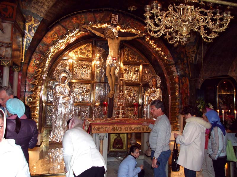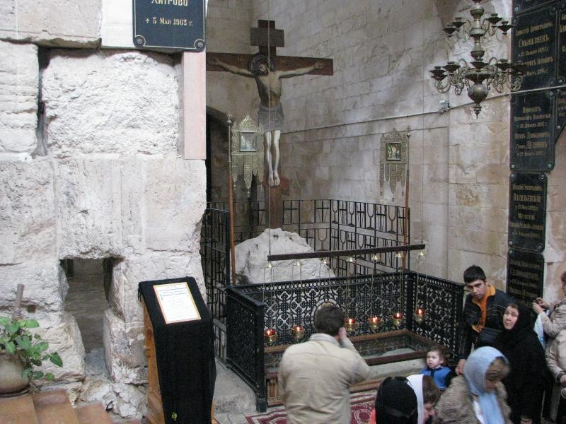 2) Голгофа, то самое место где был распят небезызвестный персонаж. Все шито белыми нитками. Храм построен в 4 веке. Ладно, холм похожий на Голгофу нашли. А вот то что потом "о чудо" буквально рядом в 30 метрах нашли и пещеру-склеп где он вознесся, и теперь так удобно строить храм гроба господня! Это конечно внушает сомнения.