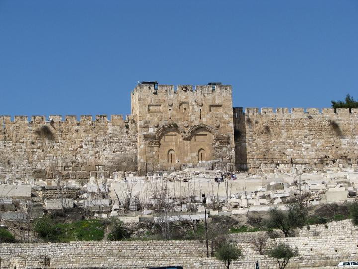 Золотоые ворота. Через них в Иерусалим войдет Мессия (наш, во второй раз, или еврейский - он еще не входил). В связи с этим мусульмане замуровали ворота, а перед ними разбили свое кладбище, мол, Мессия не может пройти через нечистое место.