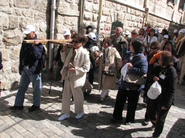 Виа Долороза. По ней шарахаются вот такие тургруппы, которые как бы повторяют путь Христа. Но в лайт-варианте, так сказать: и крест уменьшенных размеров, и несут его несколько человек, а то ведь тяжело )).