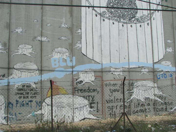 Стена ("берлинская-2"), отделяющая в Вифлееме израильскую территрию от палестинской. Как тут уже писали, стена разрисованна картинками. Главным образом- на тему страданий палестинского народа и т.п.