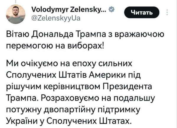 Президент Украины Владимир Зеленский поздравил Дональда Трампа с победой на выборах президента США.