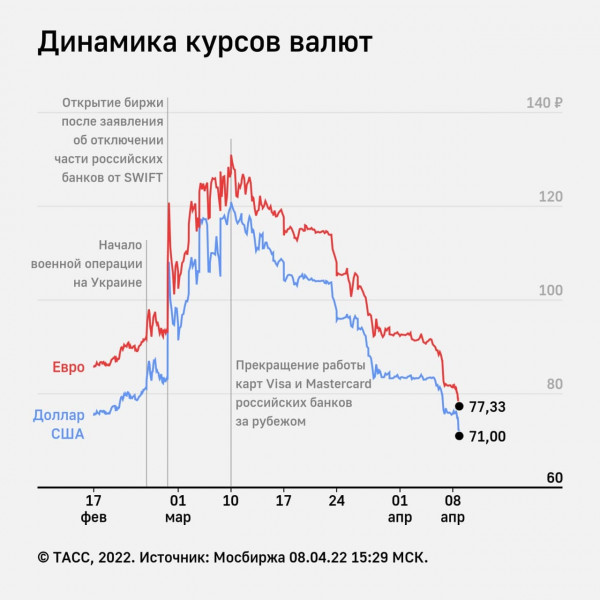 По данным Мосбиржи, курс доллара продолжил снижение и к 15:29 мск опустился до 71 руб. впервые с ноября 2021 года. Курс евро также снижался на более чем 5%, до 77,33 руб.