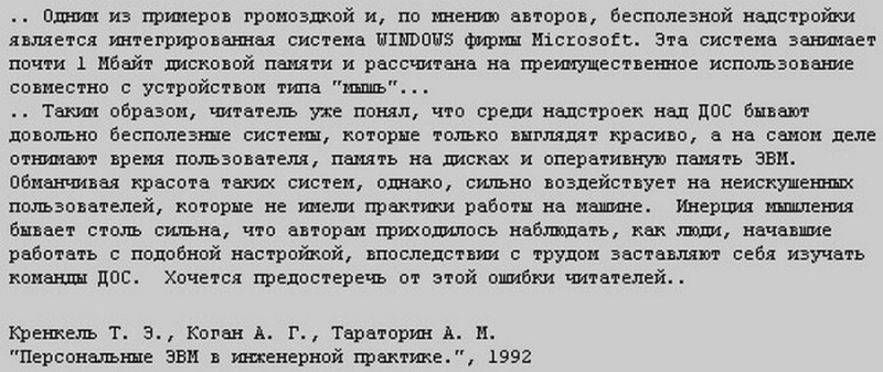 Ну а что мог автор тогда написать? Подозреваю, на его машине тогда ничего кроме DOS не запускалось принципиально :) Потому что человек, кто своими глазами хотя бы Win 3.1 видел, такого бреда не напишет.