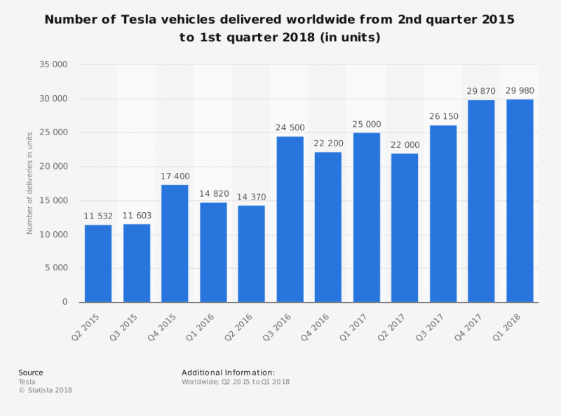 Позавчера был опубликован отчет компании Tesla Inc. за первый квартал 2018 г., в котором зафиксировано ожидаемо рекордное количество произведенных электромобилей - за отчетный период стены завода в Калифорнии покинули 34 494 машины. Из них 9 766 приходится на долю Tesla Model 3.