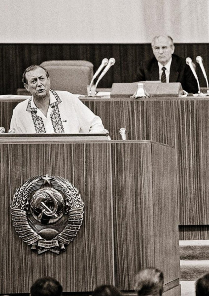 Не помню против чего, или за что, он протестовал этой рубахой, но было интересно смотреть на него на фоне пиджаков и галстуков.