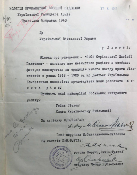 На фото — письмо героя: «Известие о создании дивизии СС «Галичина» наполняет нас невероятной радостью. Хайль Гитлер!», — пишет Михаил Омельянович-Павленко.