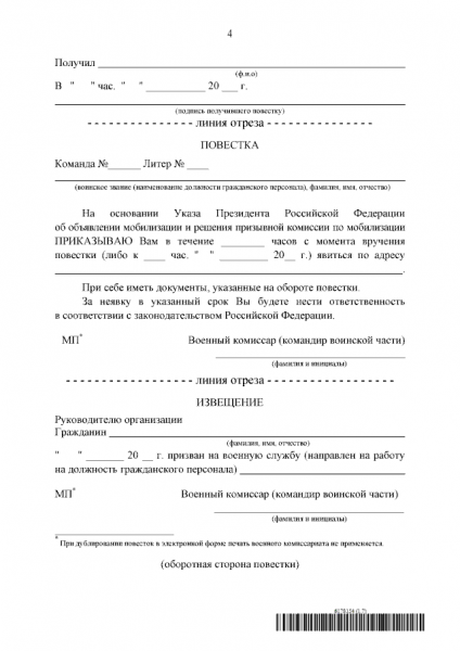 "Российское правительство утвердило форму повестки по мобилизации. Ранее военкоматы пользовались типовой формой повестки по призыву.