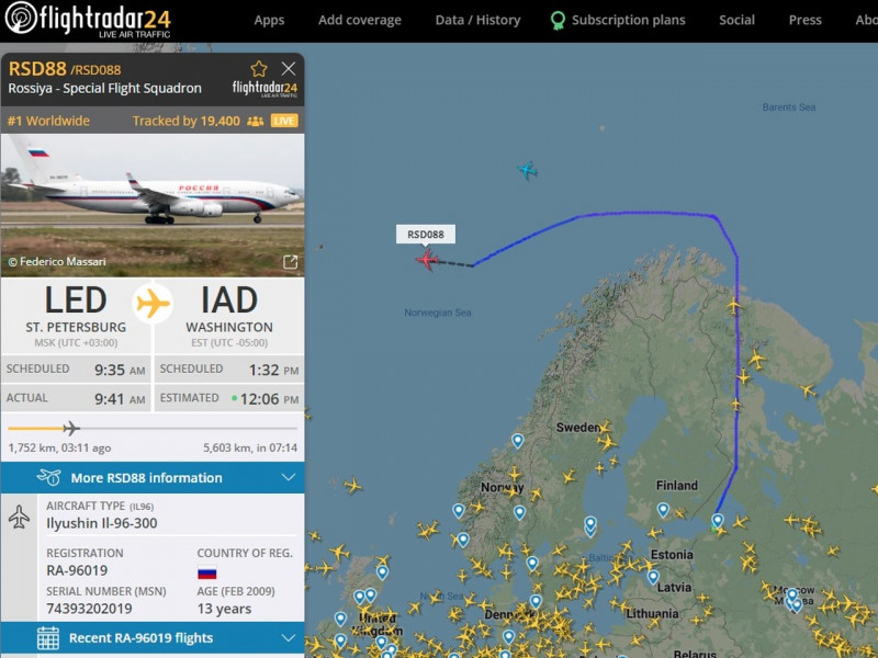 Судно вылетело в 09:41 по московскому времени и направляется в Вашингтон. По данным портала, 4 марта самолет находился в столице, откуда затем направился в Петербург.