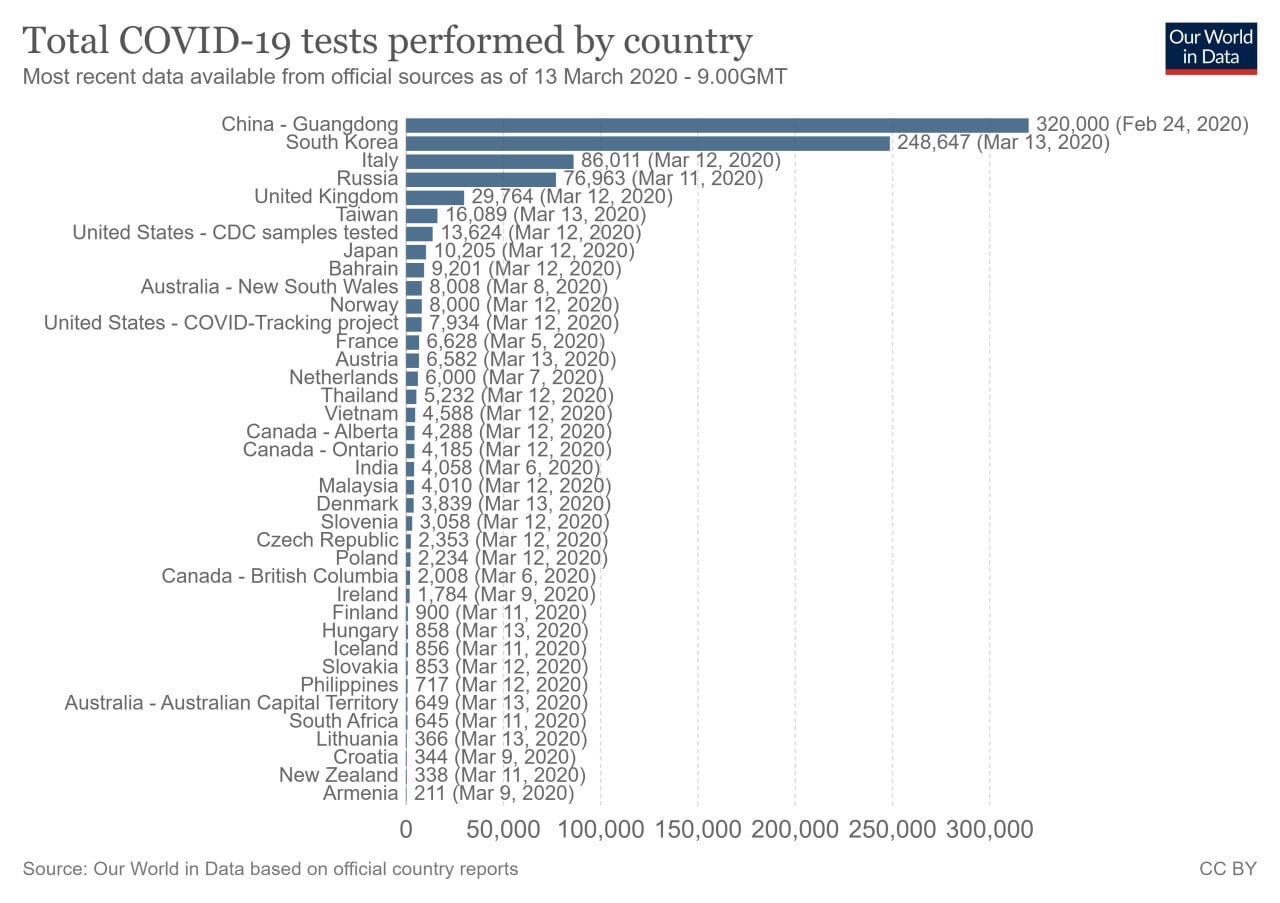 И да, даже если вы делаете в 25 раз больше тестов на душу населения, как в России, то этого то же мало. То же надо делать больше. Особенно если сравнивать с Южной Кореей, где делают по 10 тысяч тестов в день.