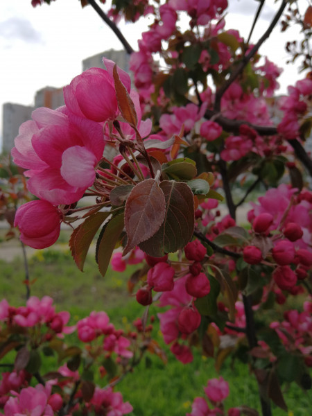 Потеплело в начале мая, зато яблони в городе уже зацвели... Или вишни.