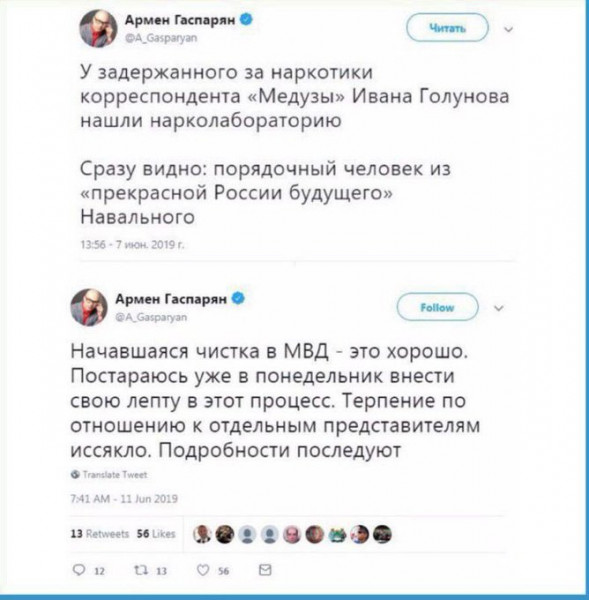 <<Власть должна действовать в правовом режиме. Относиться ко всем одинаково. Разницы нет. Есть законы. Однако и люди, которые противопоставляют себя власти, должны подчиняться действующему законодательству. Хотя, конечно, у нас есть в сообществе журналистов некоторые сомнения на счет обвинений Голунова. Мы подписали петицию. Причем не только я, но и 4 тысяч журналистов>>, - отметил Таранов....