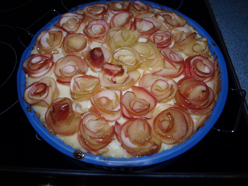 • Крем вылить на песочное тесто и сверху выложить яблочные розы.