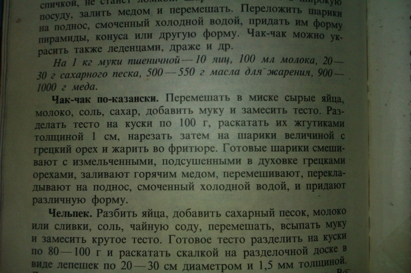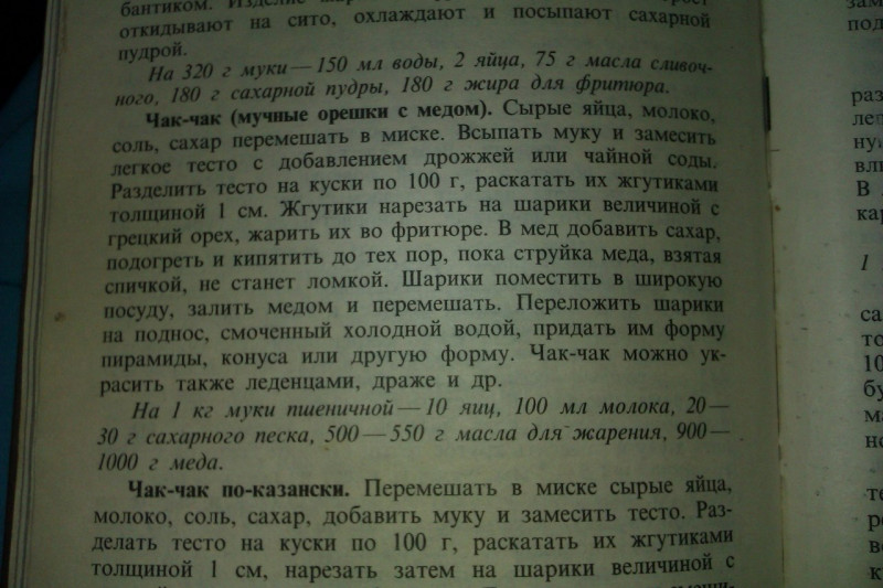 я делала чак-чак. ничего сложного. ели и магазинный и в казани, но нам с мужем больше понравился домашний . правда я делала только с медом, а по рецепту мед с сахарным сиропом смешивается. вкус еще и от качества меда зависит. у нас был разнотравный, очень душистый. вечером рецепт напишу