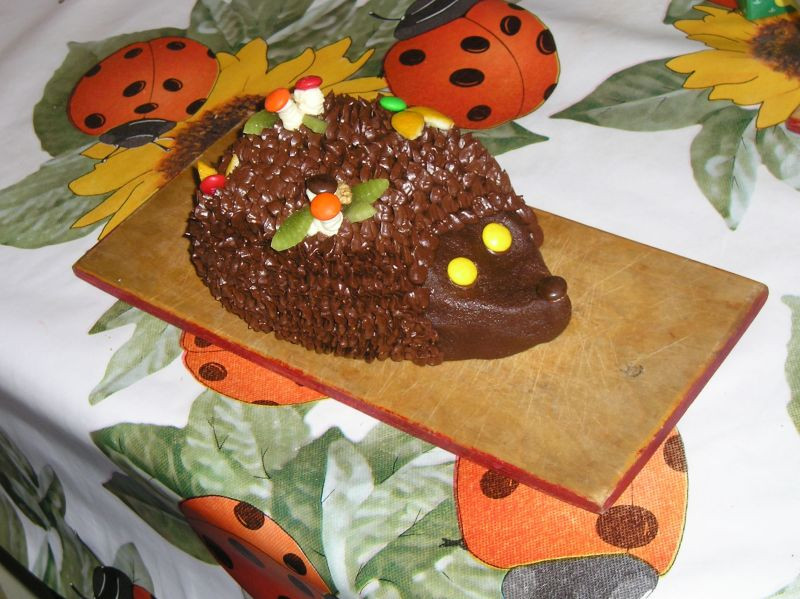 Берется темное печенье, орехи,сл. масло поддтаевшее, немного сгущенки, сахарная пудра или сах. сироп (потому что сахар может не растаять и будет неприятно скрипеть на зубах) Это все смешивается и вылепливается форма для ежа. Потом беру и из бумаги делаю карнет (это такой кондитерский пакетик, ну или обычный бумажный пакетик, в который семечки обычно кладут, вот... уголок обрезаю галочкой, чтоб крем выдавливался такими иголочками, ну и собственнно все. Для крема беру сл. масло, сгущенку и какао, взбиваю миксером и всё. А потом сделав иголочки, я украшаю ежевую спинку грибочками и ягодками - это уже все личные фантазии. Там использую фрукты, ягоды, вобщем все что угодно.