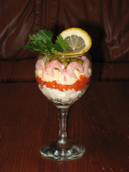 в бокал укладывается всё слоями, промазывается майонезом, украшается и все счастливы :-)