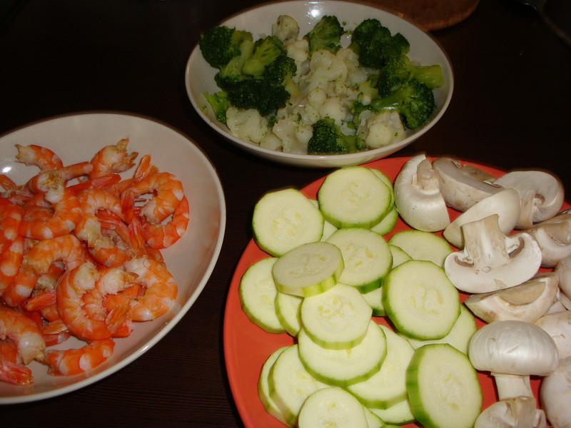 Смесь для темпуры купила готовую, ее просто надо развести в стакане ледяной воды. Нарезанный кружочками кабачок, отваренная слегка цветная капуста и брокколи, шампиньоны и крупные креветки обваливались в муке, окунались в кляр и жарились во фритюре. Кляр получился хрустящий, начинка сочная, вобщем пошло на ура!