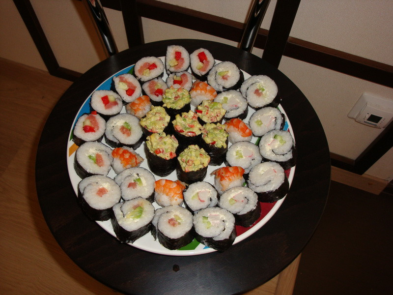 - нори-маки и футо-маки с лососем, огурцом, авокадо, сладким перцем, крабовыми палочками, кунжутом, сливочным сыром Альметте (это уже роллы Филадельфия получились),