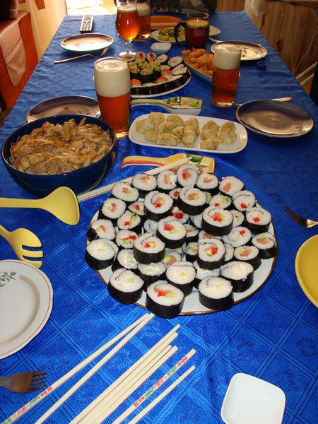Праздник труда сегодня. А кто у нас самая трудолюбивая нация? Правильно, японцы, ну по крайней мере так говорят. Посему было решено устроить обед из блюд японской кухни. По роллы и суши я подробно писать не буду, хотя они тоже были в меню, коротенько опишу начинки: