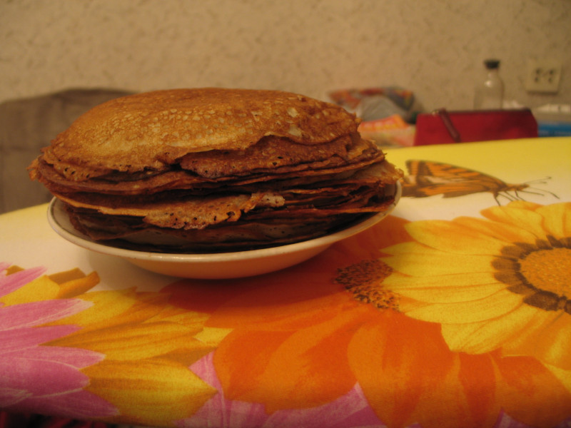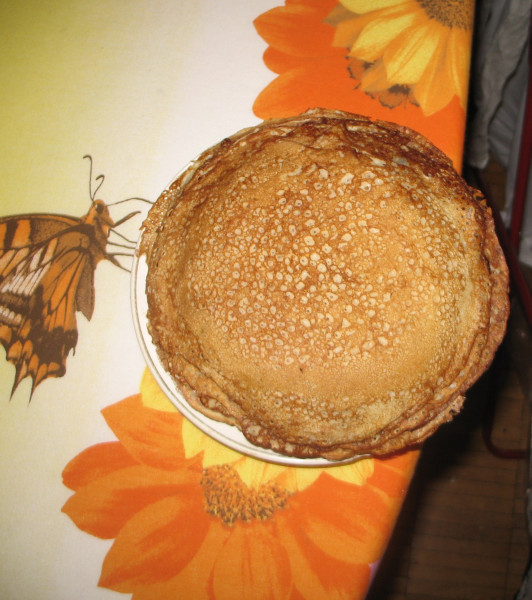 Я вчера пекла: молоко, немного кефира в него же соду, кипяток. Тоненькие, с дырочками и кружевные.