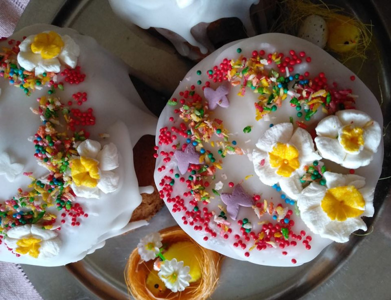 Когда подойдет вмешать в него изюм обваленный в муке и раскладывать по формам, не больше 3/4 формы. Дать еще раз подойти и печь. Горячие куличи тут же заглазировать помадой и украсить пока она не застыла.
