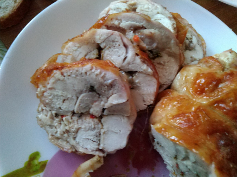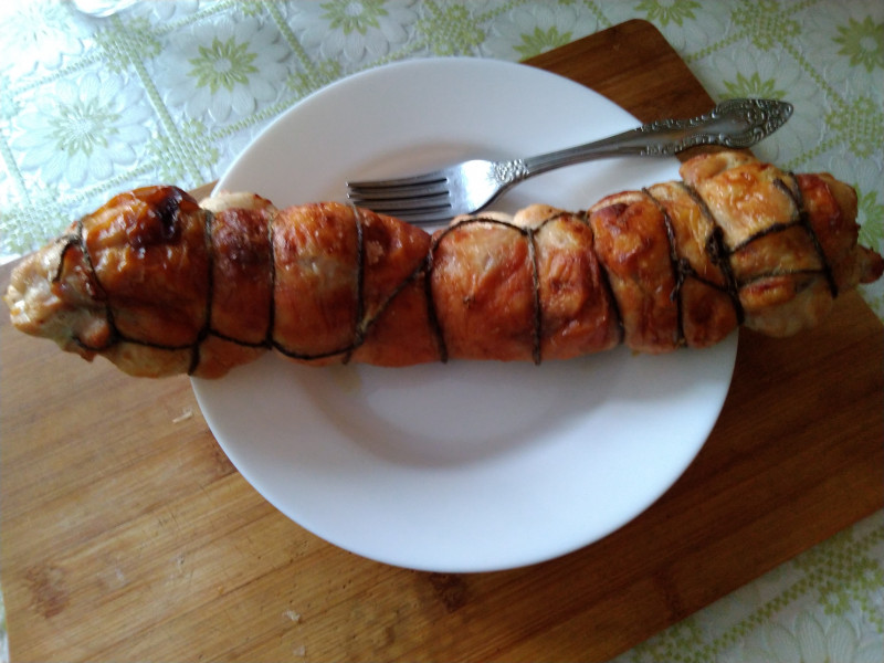 Если в духовке будете запекать, а не жарить на сковороде, то можно нарезать полосок из рукава для запекания и перевязать.