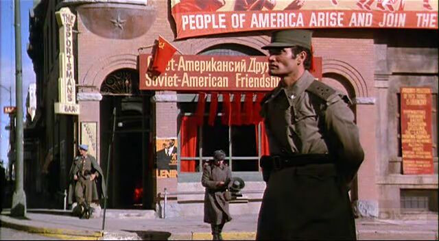 Возвращаясь к нашей теме смотрим кадры. Это стоит того! На заднем плане стоит здание оккупационной администрации, которое называется "Совеt-Американсий Дружба Цнтр". Ниже переведено на английский "Soviet-American Friendship Center" . Выше висит пролетарский плакат "PEOPLE OF AMERICA ARISE AND JOIN THE REVOLUTION". У входа в бывший капиталлистический кабак висит портрет Ильича в кепке, который охраняет десантура в голубой беретке.