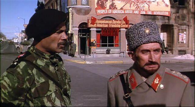 Я добавлю пару кадров из этого же фильма. "Крассный рассвет" (Red dawn) называется, если кто не помнит. Воспримается, скорее, как черная комедия в духе "Доктора Стренджлав" Кубрика, но это не так. Фильм снят в разгар "рейганомики" режиссером с крайне-правыми взглядами (автор Конана Варвара), финансировался Министерством Обороны, и являет собой самый выдающийся шедевр военной пропаганды.