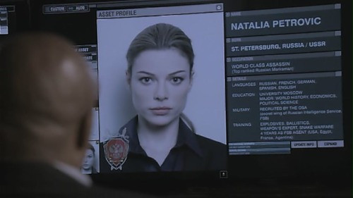 Знакомьтесь: шпионка и снайпер ФСБ Наталья Петрович. Петрович имеет фсбешный ворд класс ASSASSIN, а это гораздо круче, чем класс SWORDSMAN, а тем более PEASANT. Ниже указаны всевозможные скилы, то бишь навыки, как мирные, так и не очень, совсем, как в компьютерных игрушках. Вот уровень навыков по сексу к сожалению не указан, тут у них промашка вышла, так что придется раскрывать тему в следующем сезоне.
