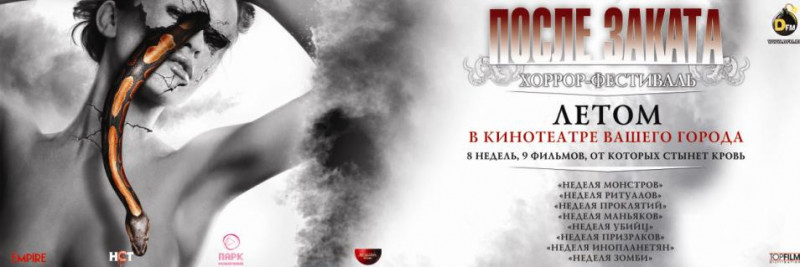 14 июня в кинотеатре "Синема Парке" состоится открытие фестиваля фильмов ужасов "После заката", который продлится 8 леденящих душу недель. Каждая неделя будет посвещена новой "жути": призраки, маньяки, монстры, зомби и инопланетяне... В рамках фестиваля будут представлены 9 совершенно новых фильмов ужасов, которые снимались специально для него: «Плодородная земля», «Шелуха», «Близнецы-убийцы», «51», «Вой Банши», «Задание», «Убить заново», «Племя».