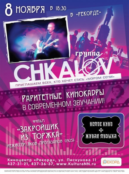 8 ноября в 18.30 киноцентр «Рекорд» приглашает зрителей на MIX: художественный фильм «Закройщик из Торжка» (1925 год), режиссёр Яков Протазанов, и эксклюзивное музыкальное сопровождение от группы «Chkalov»!