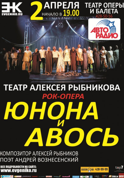 «Юнона и Авось» — самая известная рок-опера на российской сцене. Авторы – выдающийся русский композитор Алексей Рыбников и поэт Андрей Вознесенский. Премьера рок-оперы «Юнона и Авось» состоялась в 1981 году на сцене Московского театра "Ленком", и вот уже почти 30 лет идет с неизменным успехом и полным аншлагом. В 1983 году знаменитый французский кутюрье Пьер Карден представил “Юнону и Авось” французской публике в театре “Эспас Карден”, затем последовали триумфальные гастроли по всему миру: США, Германия, Голландия и другие страны. Впоследствии опера была поставлена в Польше, Венгрии, Чехии, Германии, Южной Корее.