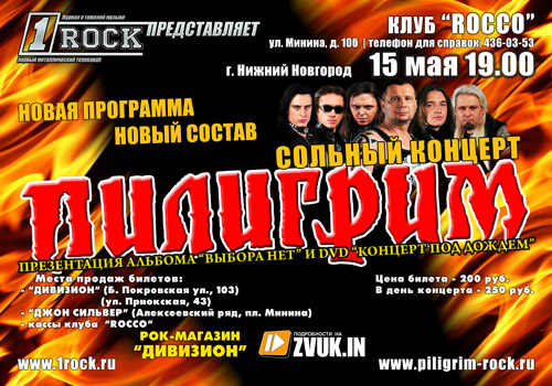 15 мая 2009 г. в клубе «Rocco» (ул. Минина, 10б) пройдет сольный концерт группы "ПИЛИГРИМ" в городе Нижний Новгород. Стоимость билетов 200 рублей, в день концерта - 250 рублей. Девушкам вход бесплатный. Начало в 19 часов.