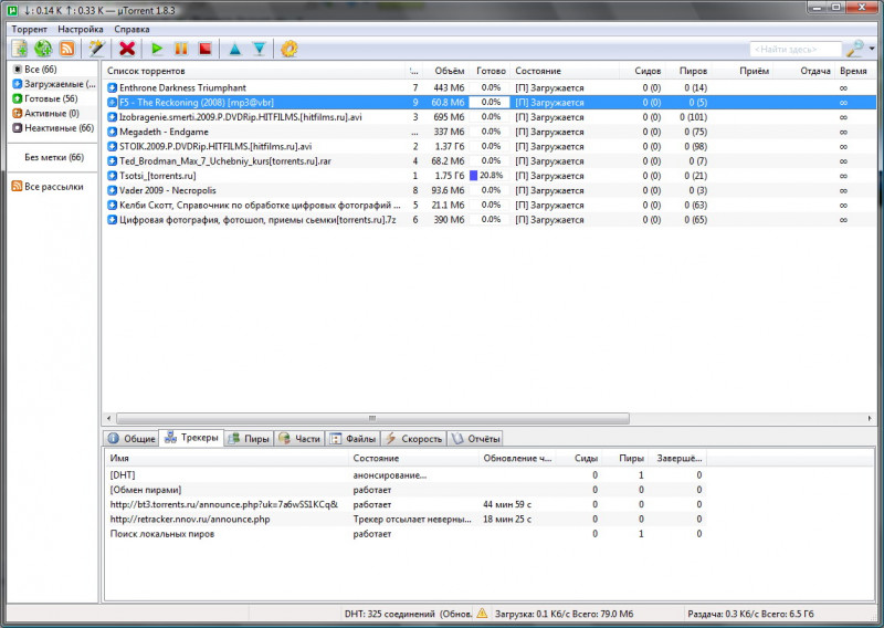 стоят закачки неделями при наличии кучи сидов... при этом на отдачу тоже скорость скачет - то 5-7, то по 50-60 кбс отдаёт.
